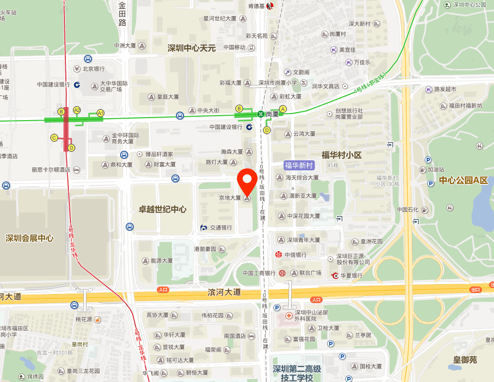 项目位于深圳市福田区彩田路与福华三路交汇处,距离岗厦地铁站约336米,占据福田CBD中心地段,环绕深圳中心公园、莲花山公园等生态景观,周边覆盖深圳音乐厅、图书馆、市民中心等高端娱乐休闲场所,拥揽深圳核心的商业、生态资源,交通便利,配套服务完善,是京地集团开发的首座生态写字楼。项目是一幢30多层高的办公楼,占地面积3980平方米,总建筑面积约为44838平方米。